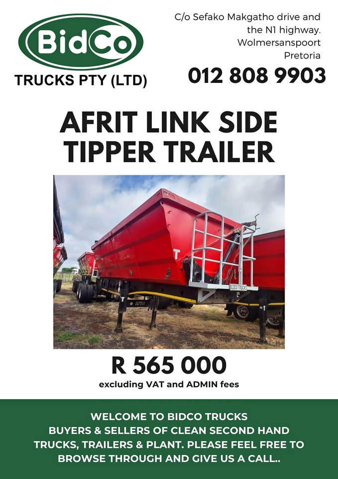 Visit us at our yard for more trucks, trailers and plant equipment. We thrive to help you in expanding your fleet. If we don't have it we make it our mission to find it for you. - Prices are excluding vat and admin fees. AVAILABLE TO VIEW AT: Bidco Trucks C/o Sefako Makgatho drive and the N1 highway. Plot 28, Wolmeranspoort, Pretoria, 0035 TEL: / 4 / 5 WHATSAPP: LEVISON: OR JULIUS: .
