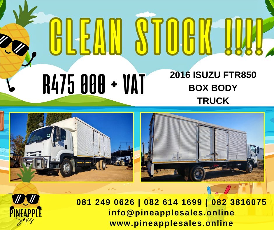 Contact me if you are interested: 0️⃣8️⃣1️⃣2️⃣4️⃣9️⃣0️⃣6️⃣2️⃣6️⃣ 2016 Isuzu FTR850 Box Body Truck VERY NEAT AND CLEAN TRUCK! FSH at the logistics company Located : Pretoria east on Garsfontein road 𝗢𝗿 𝘃𝗶𝗲𝘄 𝗮𝗹𝗹 𝗼𝘂𝗿 𝘀𝘁𝗼𝗰𝗸 𝗼𝗻 𝗼𝘂𝗿 𝘄𝗲𝗯𝘀𝗶𝘁𝗲 www.pineapplesales.online