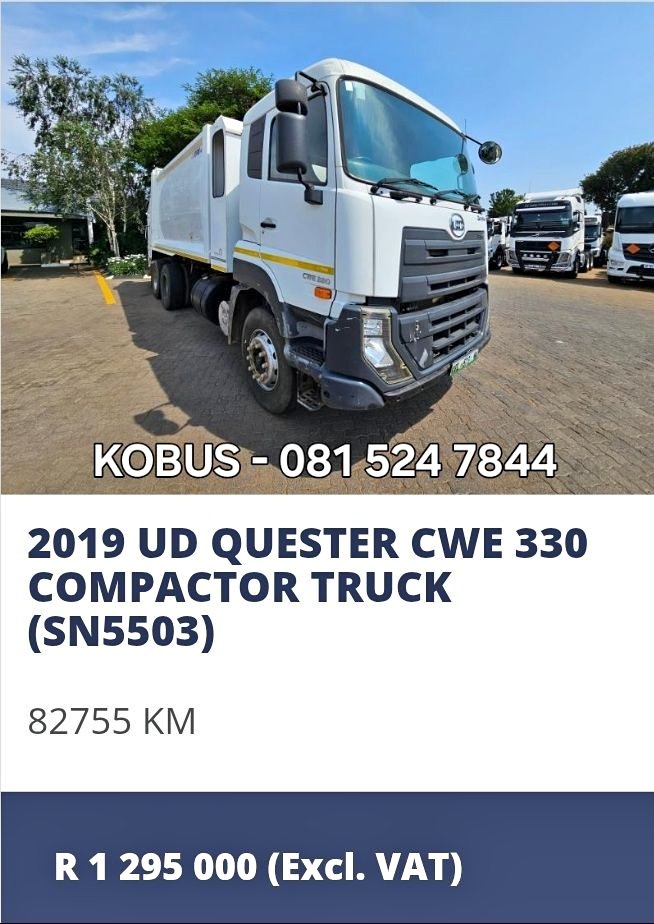 2019 UD QUESTER CWE330 COMPACTOR BIN 20m3 82 700KM R1 295 000 EXCLUDING VAT KOBUS -