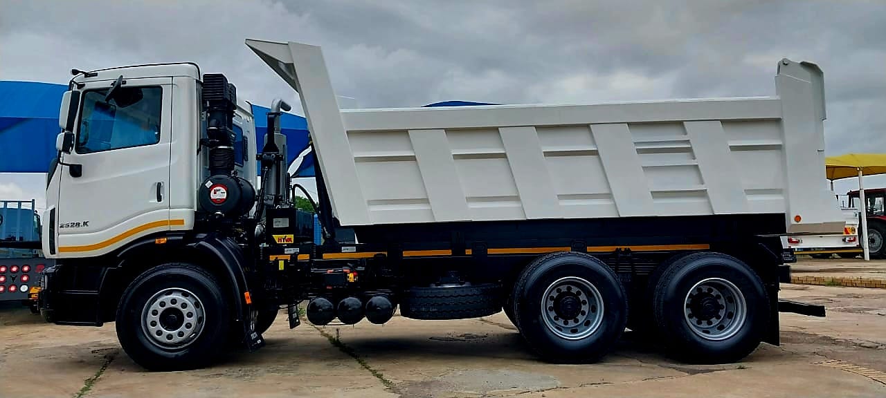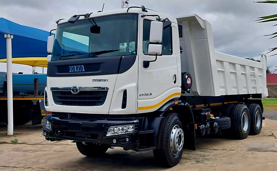 The New Tata Prima 2528K is a tipper truck model with a Gross Vehicle Weight (GVW) of 25,000 kg. It is powered by a 267 HP (or 266 BHP) Cummins ISBe CRDi 6.7L engine, delivers 970-975 Nm of torque, and features a 9-speed ZF manual transmission. The truck is designed for hauling loads and includes features like parabolic leaf spring suspension at the front and a bogie suspension at the rear.